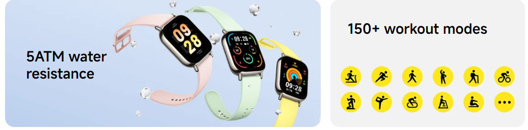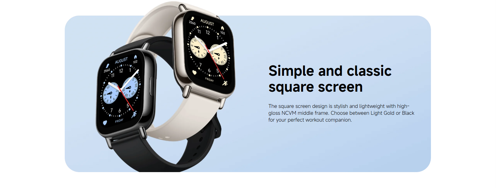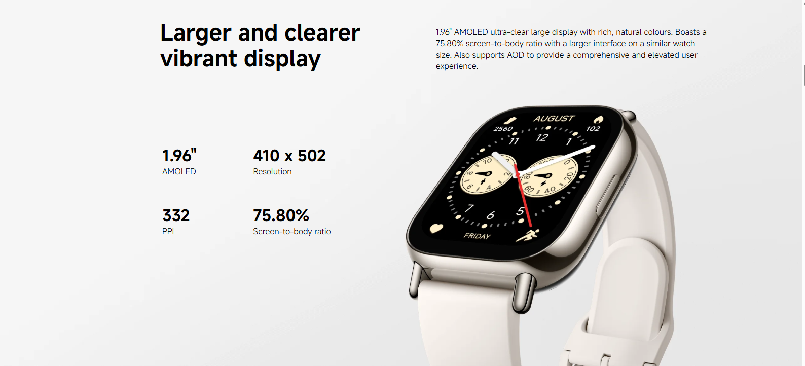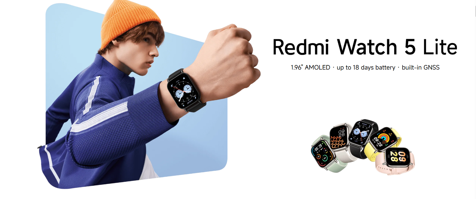 Read full specifications ↓Elevate everyday wristwear with the Redmi Watch 5 Lite—a premium-feel smartwatch that’s accessible to everyone. Its vivid 1.96″ AMOLED display (410 × 502 px, ~332 PPI, 75.8% screen-to-body ratio) delivers rich colors and supports Always-On Display (AOD), ensuring seamless readability even in direct sunlight. The lightweight square form factor sports a high-gloss NCVM middle frame in Black or Light Gold and comes with comfortable TPU straps in pastel hues.