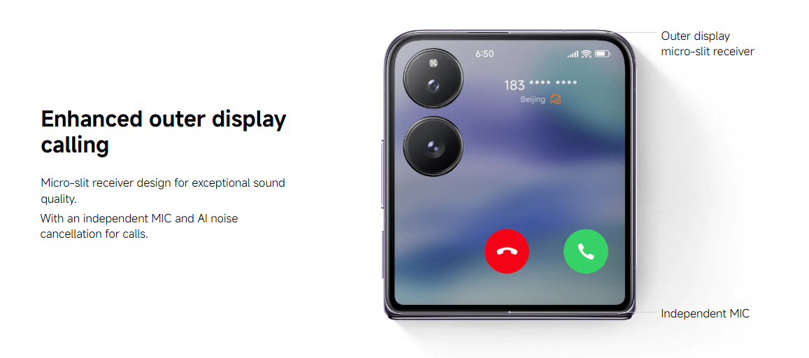 A stylish and powerful clamshell: Snapdragon 8 Gen 3, 6.86″ 120 Hz foldable AMOLED, expansive 4.01″ outer screen, Leica-tuned dual 50 MP cameras, and 67 W fast charging in a compact, elegant form.