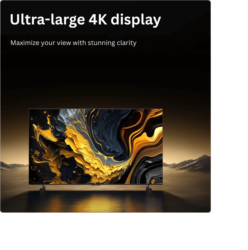 Read full specifications ↓The Xiaomi TV Max 100 2025 redefines home entertainment with its ultra-large 100-inch QLED display, offering 4K UHD resolution (3840 x 2160) and a 94% DCI-P3 color gamut for vibrant, true-to-life colors. Its 144Hz refresh rate, combined with 4K 120Hz MEMC and a 240Hz Game Boost mode, ensures smooth visuals for fast-paced content like sports and gaming. The TV supports Dolby Vision, HDR10+, HLG, and Filmmaker Mode for a cinema-quality experience, while full-array local dimming enhances contrast. Powered by a Quad-Core Cortex-A73 processor, 3GB RAM, and 32GB storage, it runs Google TV for seamless access to over 10,000 apps, Chromecast, and Apple AirPlay. Connectivity includes Wi-Fi 6, Bluetooth 5.2, and three HDMI 2.1 ports with VRR and ALLM for low-latency gaming (4ms). The audio system features dual 15W speakers with Dolby Atmos and DTS:X for immersive sound. Its minimalist metal frame and bezel-less design add elegance, though its 59.6kg weight requires sturdy installation.