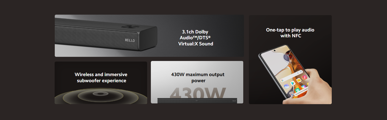 Transform your living room into a movie theatre with the Xiaomi Soundbar 3.1 ch, delivering powerful 430 W output, wireless subwoofer, Dolby Audio & DTS Virtual:X, multi-port connectivity, and AI-enhanced sound modes—packed into a sleek.