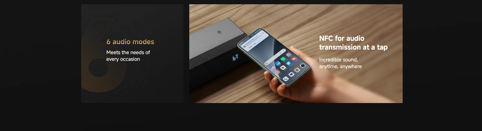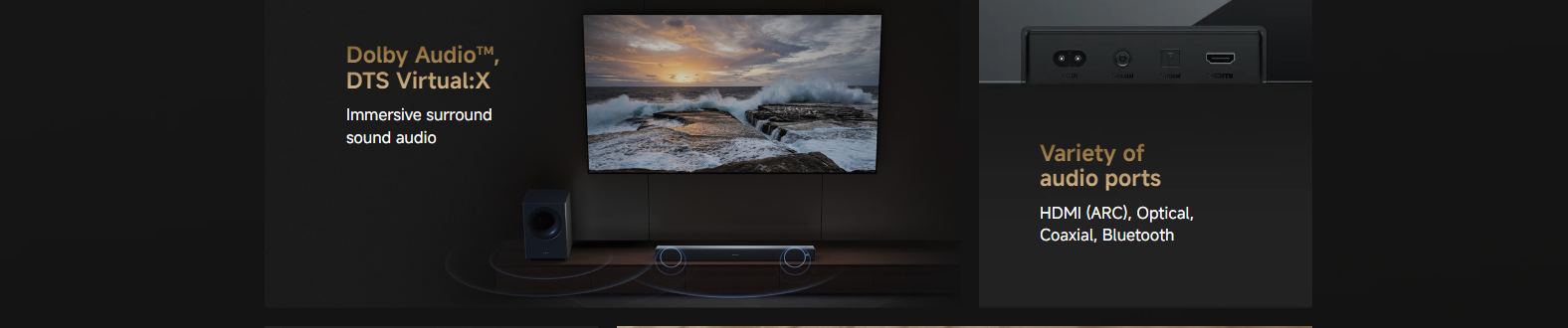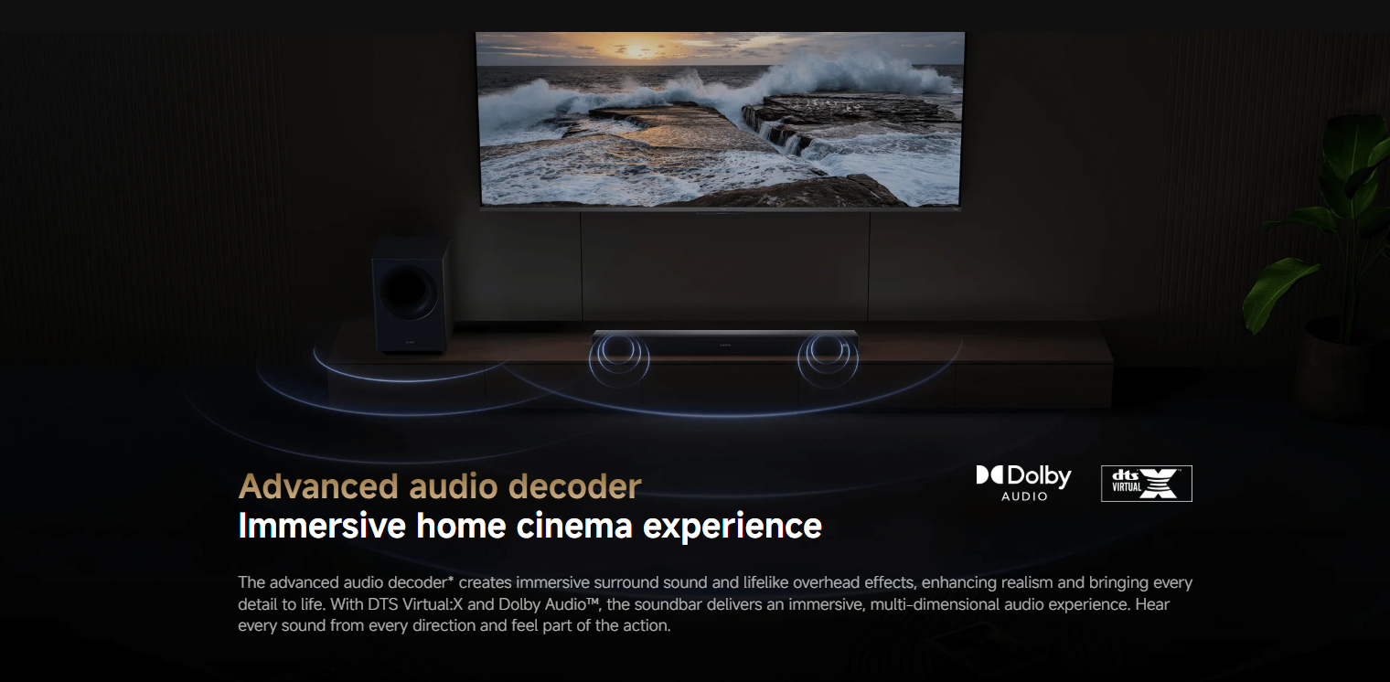 A cinematic upgrade: 300 W 2.1-channel soundbar with wireless 6.5″ subwoofer, Dolby Audio® & DTS Virtual:X, NFC pairing, and a premium Red Dot award-winning brushed-metal design.